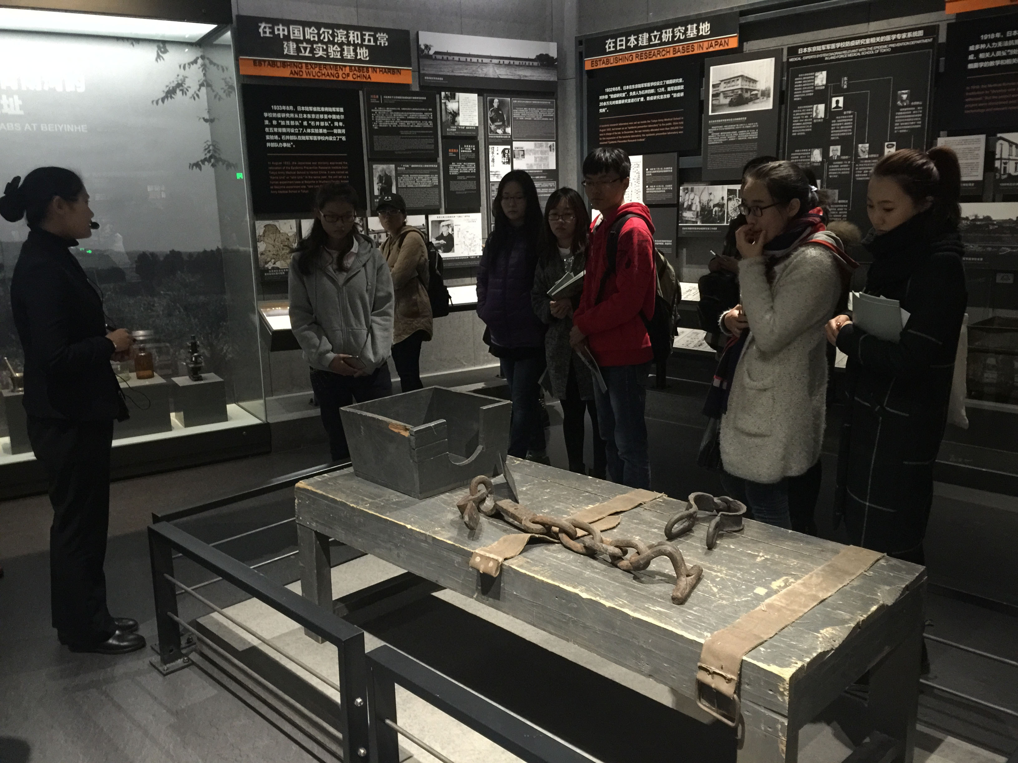 首先同学们参观了731部队罪证陈列馆。陈列馆一共分为六部分,通过讲解员的详细介绍和观看陈列品,把侵华日军建立731部队开展毒气战、细菌战的整个过程全部展现出来,一件件实验工具、一段段忏悔视频资料、一页页文字资料详细地记录了侵华日军的残暴行径以及对中国人民造成的深重伤害,一幅幅画面无不刺痛了同学们的心。然后,同学们继续参观了731部队本部大楼,实地了解了当年日军的办公环境和人员编制分工。最后,我们还看到了日本战败时,军队撤离的时候所炸毁的四方楼遗址、锅炉房遗址······裸露的钢筋张牙舞爪,好像也在诉说着日军的罪行。