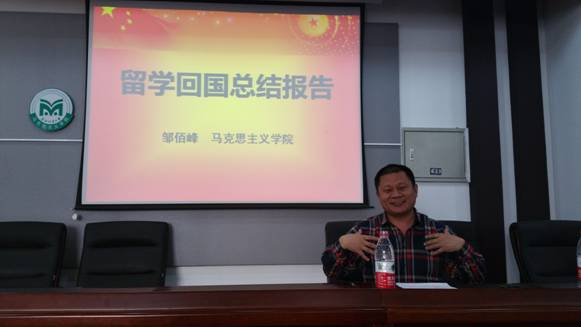 在分享了邹老师留学的经验和心得后,与会教师谈到,听了他的国外亲身经历的学术报告,感觉很真实,很有收获。希望今后能有更多的教师出国研修,然后与大家分享收获和心得体会,使大家能够开拓国际视野,了解认识外部世界,客观地认识自身发展的现状。