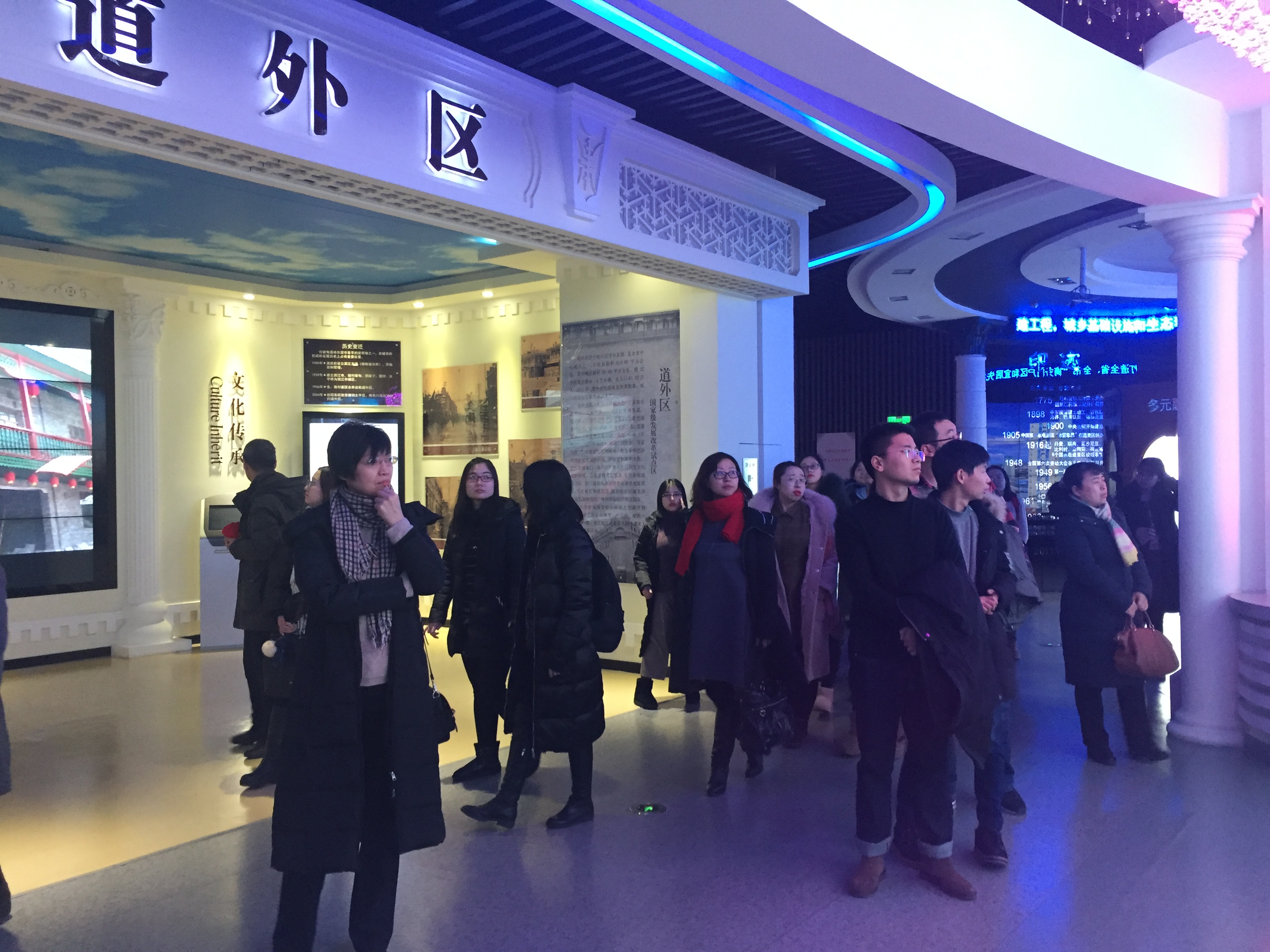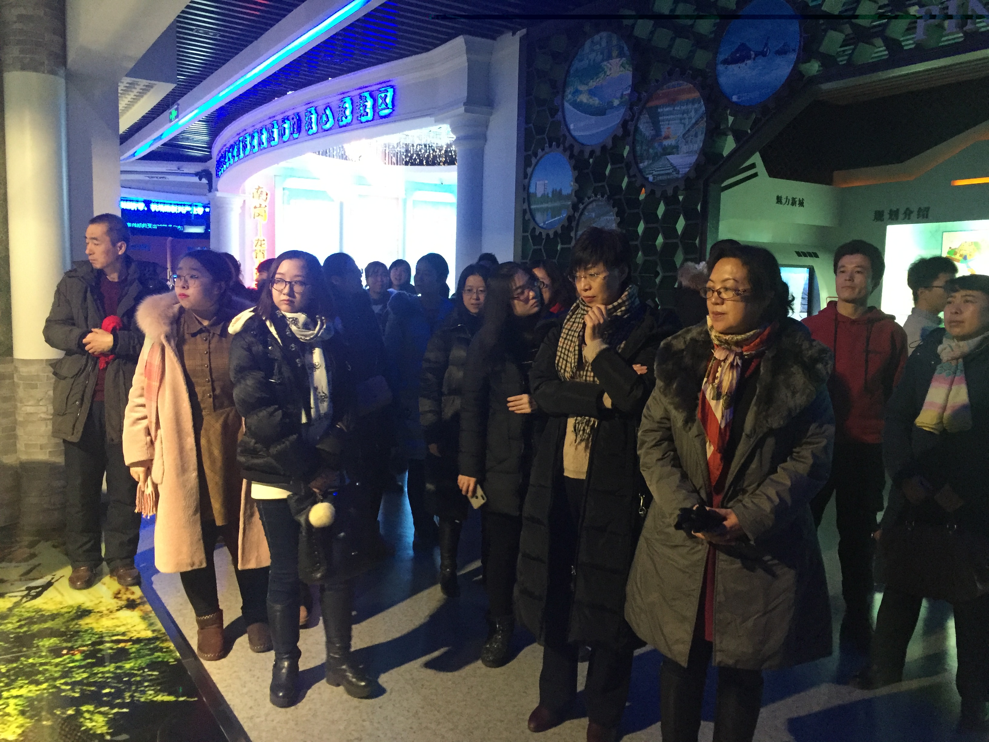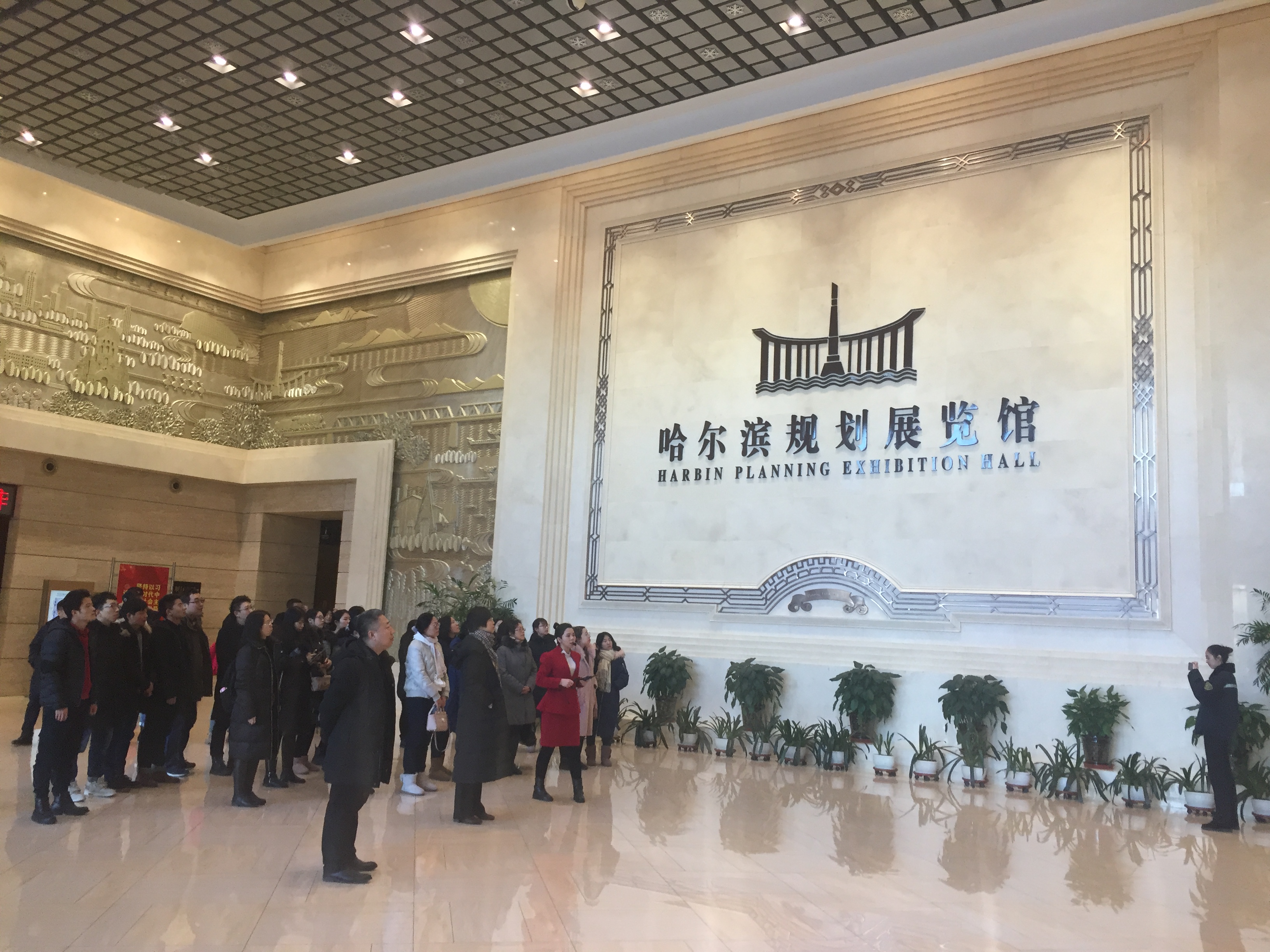 参观过程中,大家在讲解员的引导下,从环绕一楼大厅的哈尔滨市比较有代表性浮雕开始,印象哈尔滨的影片和介绍哈尔滨现代规划的立体短片,给大家留下的深刻的印象。大屏幕冲击着大家的视线,天井里是宽大、形象的哈尔滨规划的物理沙盘,伴随着影音,下面的沙盘时刻与解说的内容同步,流光溢彩。一江居中、两岸繁荣的理念印入你的脑海,南拓、北跃、中兴、强县的战略清晰可见,为我们描绘了美好的发展蓝图。