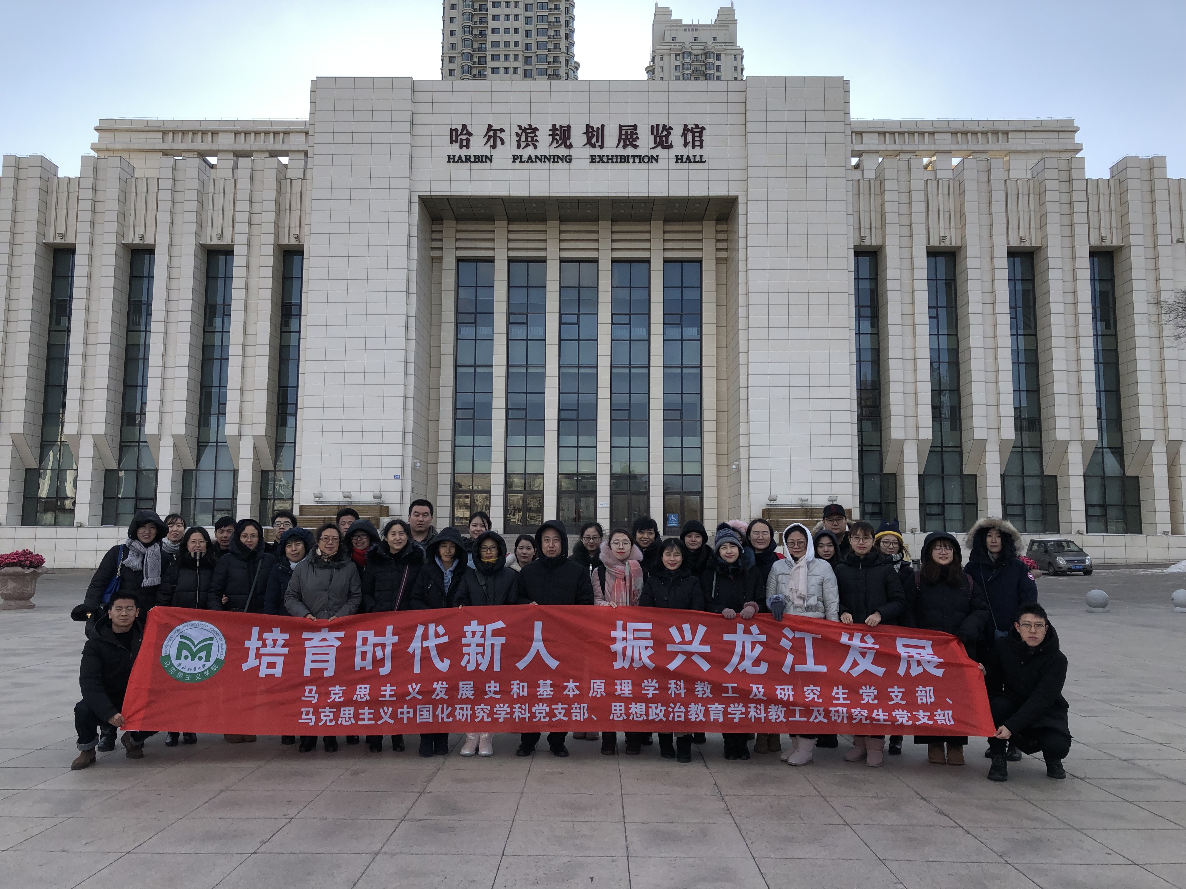 为了纪念改革开放40周年,深入学习领会习近平总书记在庆祝改革开放40周年大会上的讲话精神,推进“两学一做”学习教育常态化制度化,12月25日下午,388vip太阳集团官网马克思主义发展史和基本原理学科的教工党支部和研究生党支部、思想政治教育学科的教工党支部和研究生党支部、马克思主义中国化学科党支部以“培育时代新人 振兴龙江发展”为主题,开展了“1+1”主题党日活动,通过到哈尔滨规划展览馆参观学习,深入了解哈尔滨城市的发展历程和未来规划蓝图,感受改革开放40年的伟大历史成就和改革开放铸就的伟大改革开放精神。