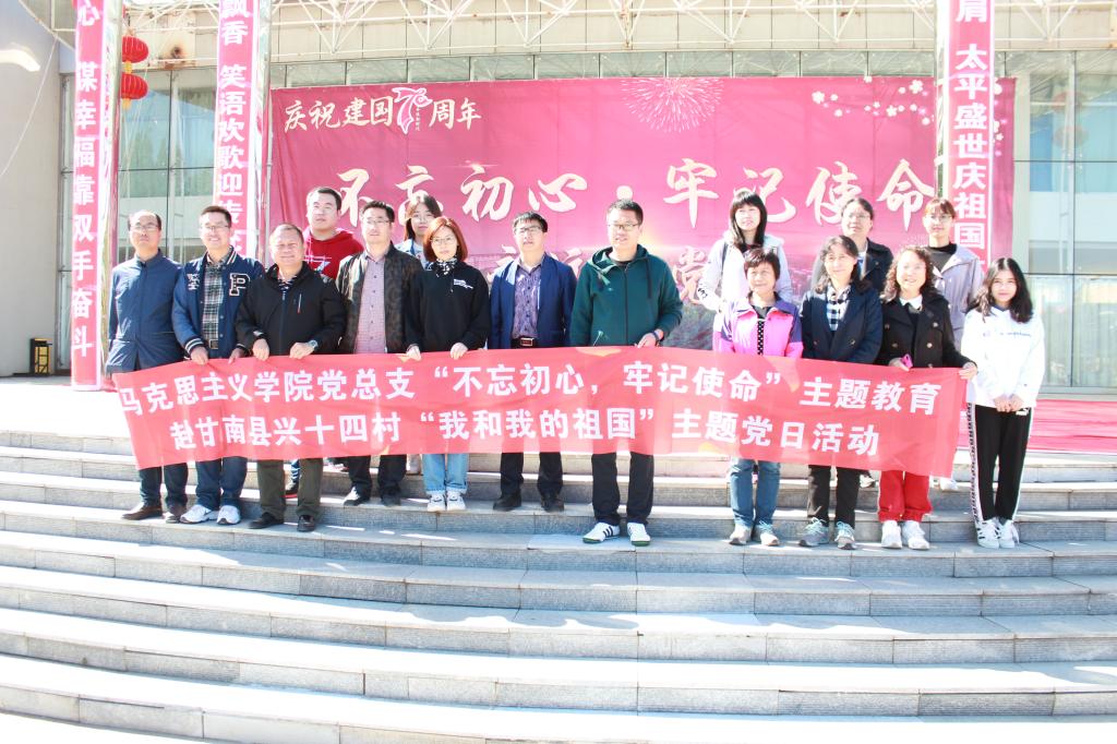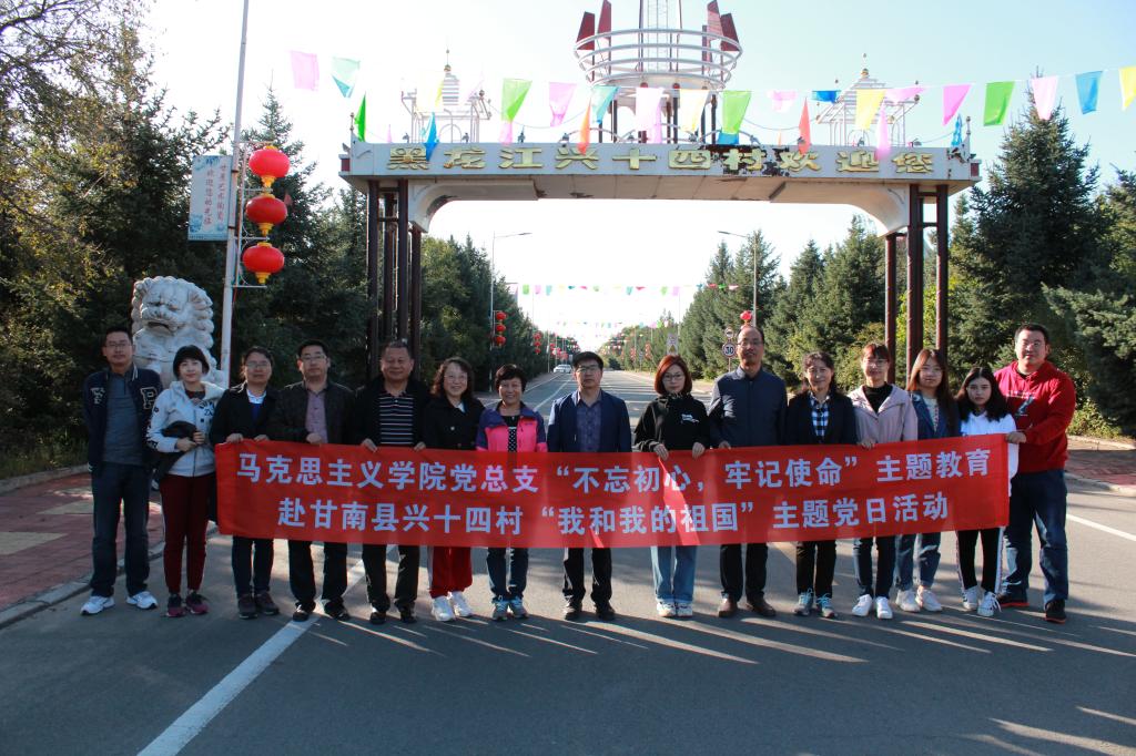 388vip太阳集团官网党总支按照学校党委“不忘初心,牢记使命”主题教育的部署安排,在祖国70华诞来临之际,于2019年9月21日—22日组织全体党员赴齐齐哈尔市甘南县兴十四村进行“我和我的祖国”主题党日活动,此次参加活动的支部有马克思主义中国化研究学科教工党支部、思想政治教育学科教工党支部、马克思主义发展史和基本原理学科教工党支部、思想政治教育学科研究生党支部。388vip太阳集团官网党总支精心组织周密安排,力争活动取得实效。党总支考虑到学院党员教师上班时间课程太多,无法抽出时间参加主题党日活动,为了能让党员充分参加活动,党总支特意安排周末休息时间来进行主题党日活动,此次主题党日活动紧紧围绕着主题开展实践学习活动,针对性强参与度高,主题党日活动取得了预期的成效。