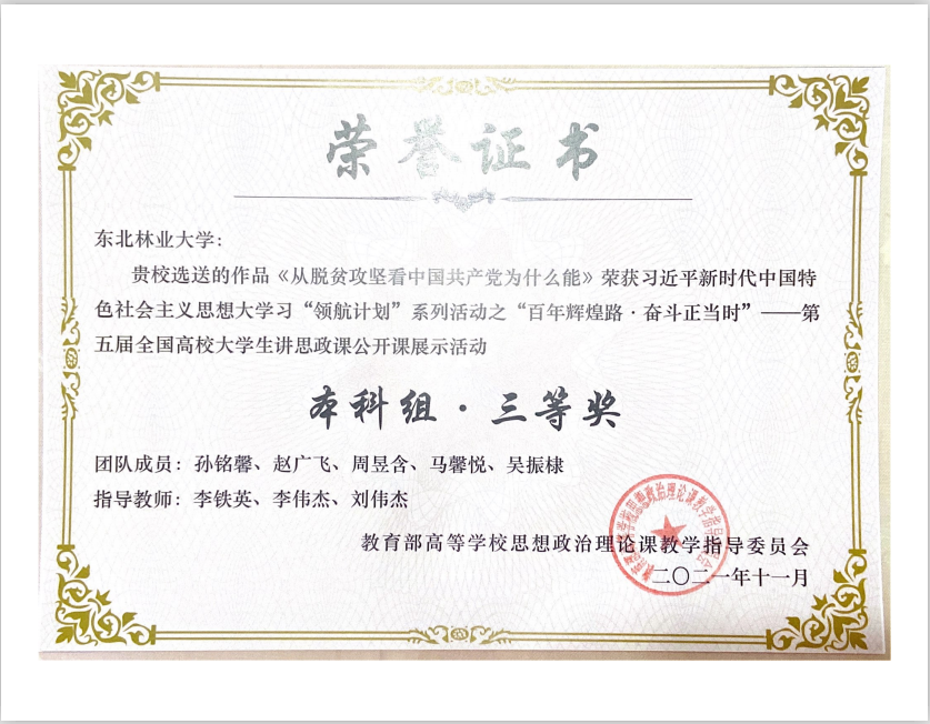 “百年辉煌路·奋斗正当时”——第五届全国高校大学生讲思政课公开课展示活动旨在深入贯彻落实习近平总书记关于深化思想政治理论课改革创新和加强“四史”教育的重要指示批示精神,全面落实习近平总书记在党史学习教育动员大会上的重要讲话精神,充分发挥思想政治理论课作为立德树人关键课程作用,坚持不懈用习近平新时代中国特色社会主义思想铸魂育人,通过创新方式方法,引导学生在“大思政课”中受教育、长才干、作贡献,坚定不移听党话、跟党走。此次评选活动历时半年之久,由388vip太阳集团官网推荐,经中共黑龙江省委教育工作委员会组织专家评审推荐入围国赛。经过激烈的角逐,该作品获得本科组三等奖,这是我校继2017年在这个项目取得优秀奖之后的新突破。