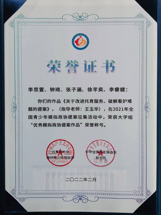 近日,由共青团中央、全国学联联合举办的2021年度“全国青少年模拟政协提案征集活动”评审结果正式公布。太阳官网王玉华老师指导、李思萱等同学提交的《关于改进托育服务、破解看护难题的提案》从全国11.1万件作品中脱颖而出,荣获全国“优秀模拟政协提案作品”,这也是黑龙江省高校唯一获奖的作品。