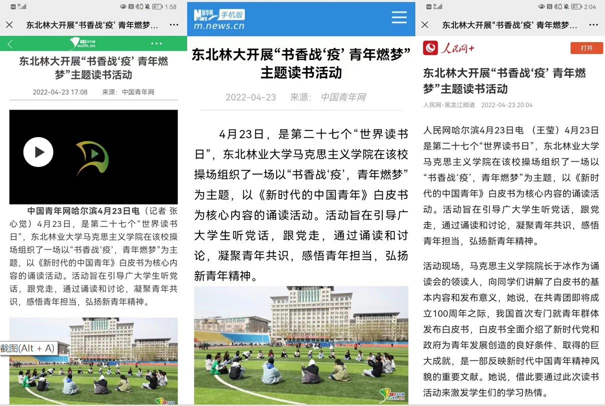 1.中青网发布东北林大开展“书香战‘疫’ 青年燃梦”主题读书活动。