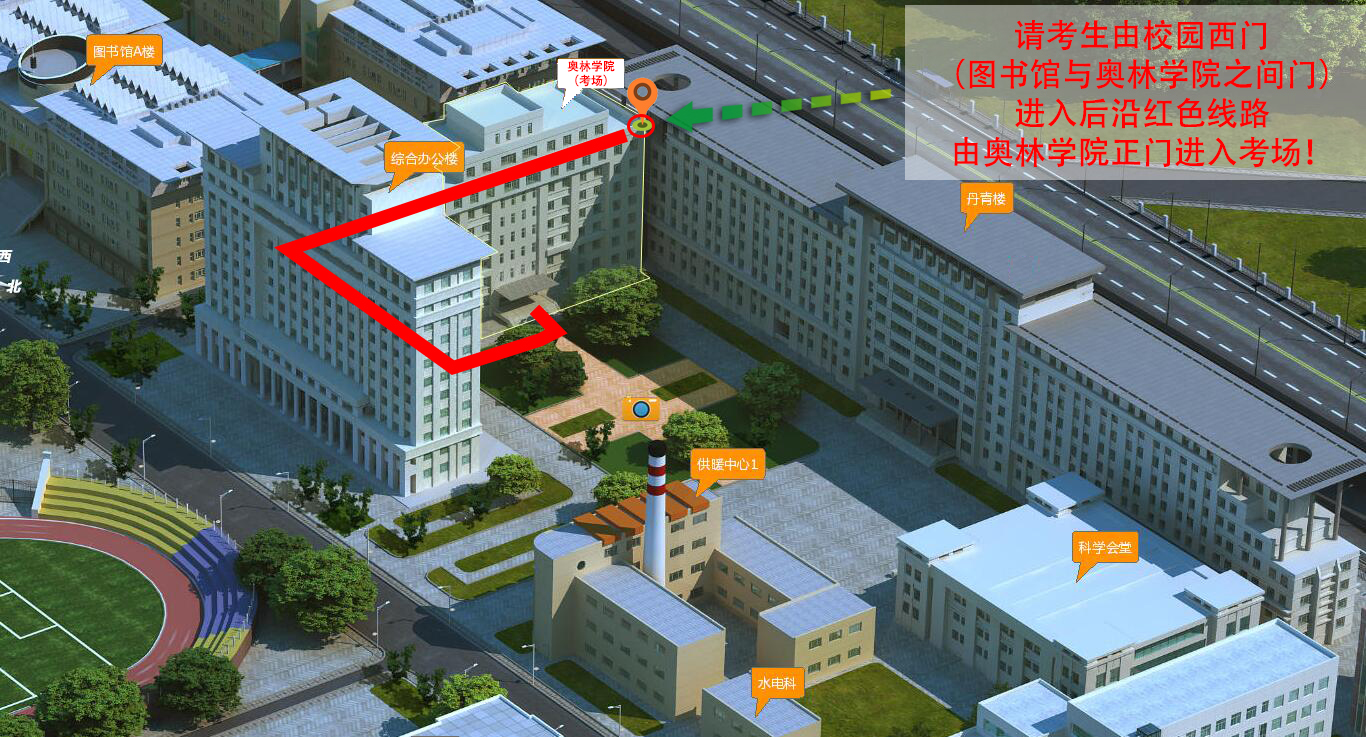 本次考试所有考生均由奥林学院正门进入考场楼(考场分布图在考区入口及候考区设置),入楼后须配合工作人员的体温检测和消毒工作,并进入指定候考区。